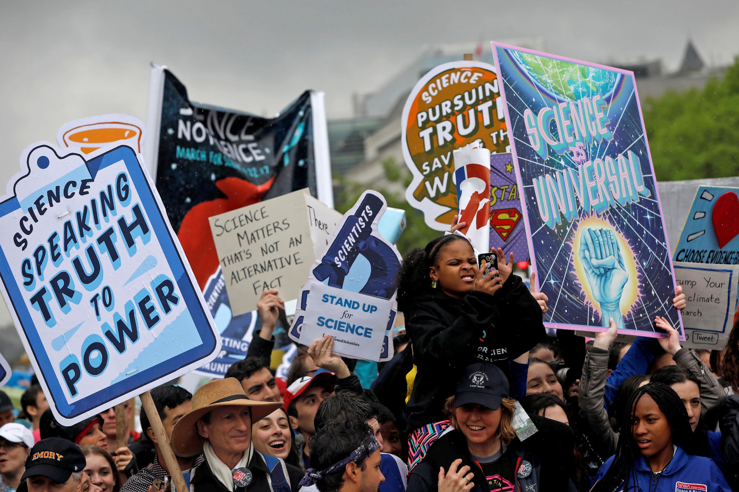 Craig Fryer, 47, marched down Constitution Avenue alongside several of his colleagues from the University of Maryland School of Public Health, all wearing T-shirts that read “Black Scientists Matter.” Fryer, a behavioral scientist who studies substance abuse, carried a sign that proclaimed “Black Scientists Speaking Truth to Power.” He said he and his colleagues are concerned about racial disparities in funding for research.